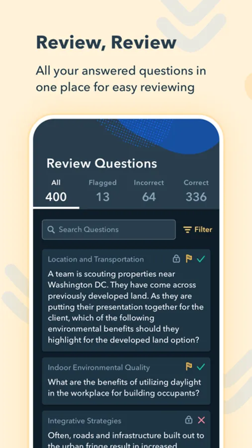 - Sort by flagged or incorrect questions