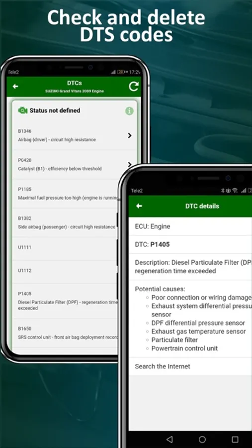 • It decodes fault codes (OBD2 Trouble Codes), including the causes of widespread codes, and allows you to turn off the Check Engine lamp
