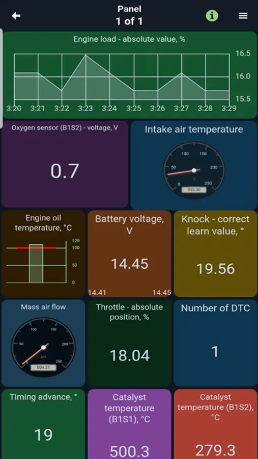 • Dashboard. You can configure a dashboard for each ECU which supports parameters, using 18 variants of templates and choosing the following types of display: text, arrow pointer, bar chart, and graph