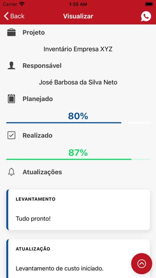O aplicativo permite ao cliente da M1 Consultoria obter informações em tempo real do andamento dos seus projetos. Podendo acompanhar o planejado x realizado, informações sobre a etapa do trabalho desenvolvida, receber documentações, fotos, videos, e ainda permite um link para o Whatsapp do encarregado do projeto.