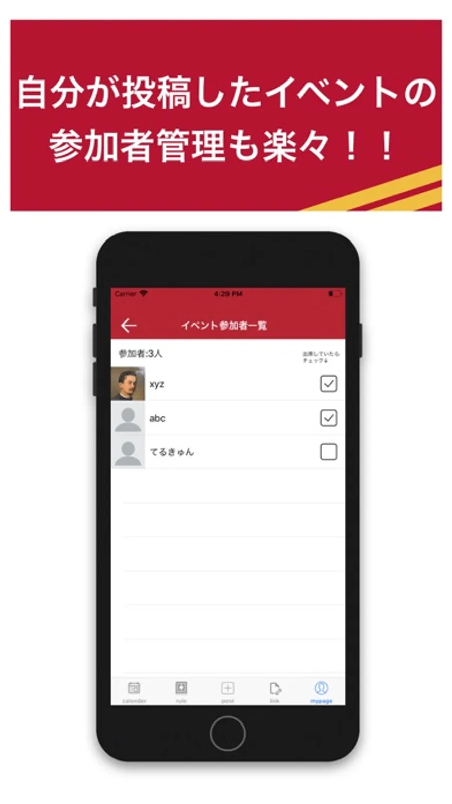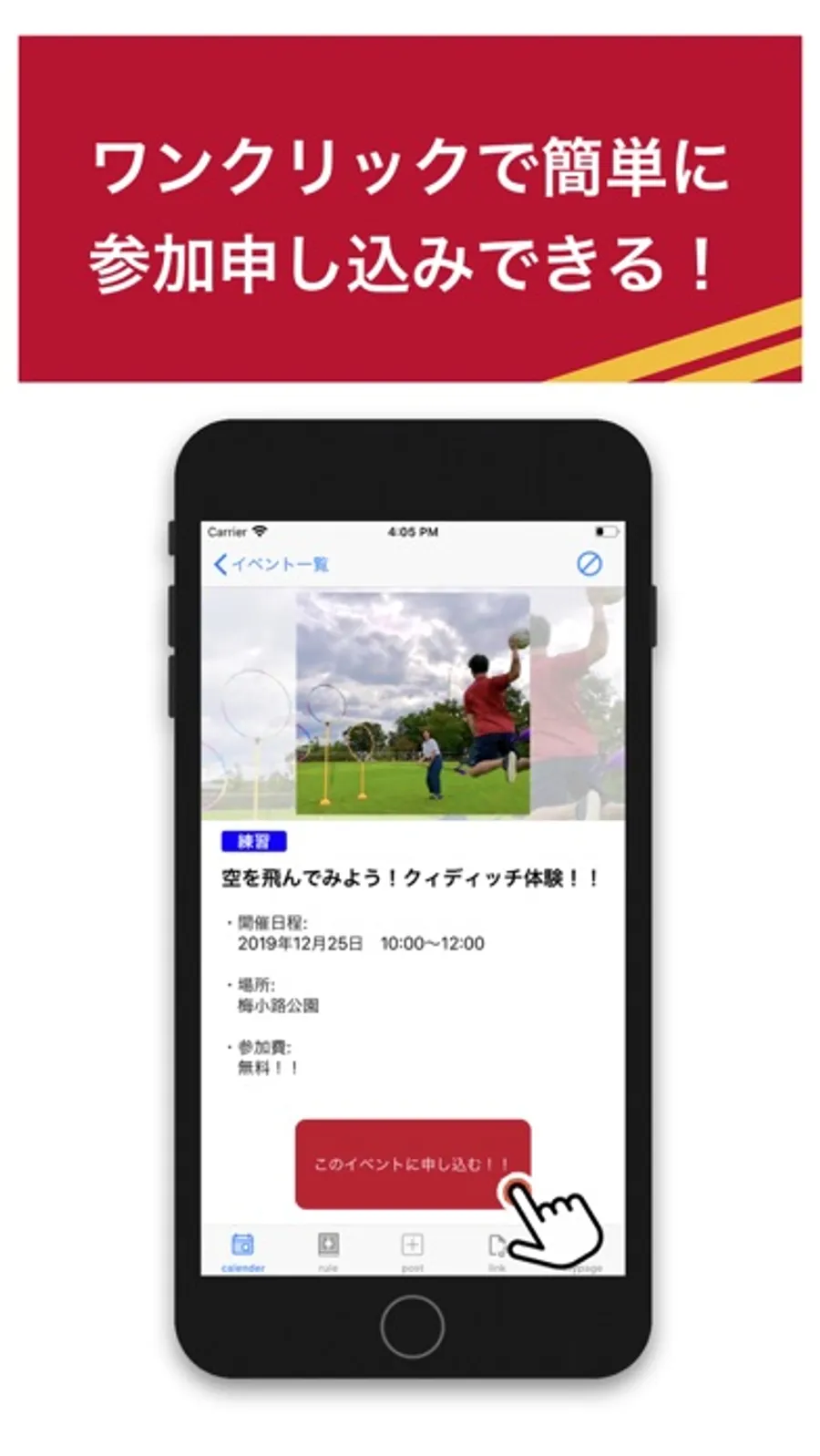 このアプリでは、各チームの主催するイベントや体験練習の日程を一覧でき、簡単に参加申し込みをすることができます。
