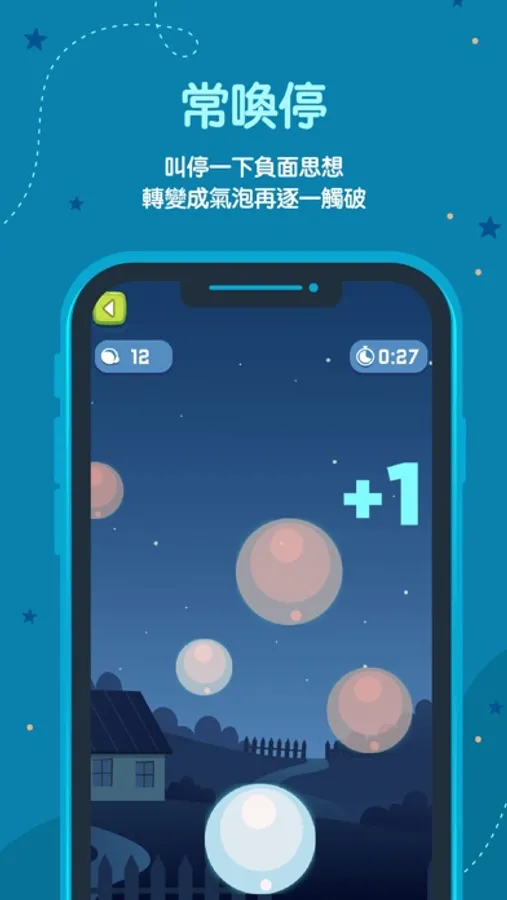 • 你可能想在情緒起伏時叫停自己,不過未必想到一些實際的方法,那〈常喚停〉就可以讓你一口氣說出自己的碎碎念,製造氣泡,然後用手指輕觸就可以觸破氣泡得分,得分愈多愈好!