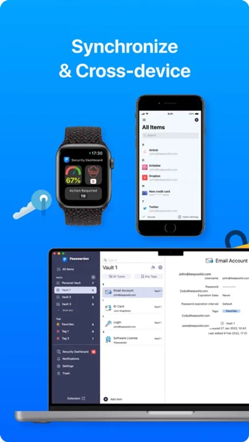 KeepSolid takes the security of your data very seriously. That’s why Passwarden uses client-side encryption (AES-256 and ЕС р-384 algorithms) both for storing and syncing your data.