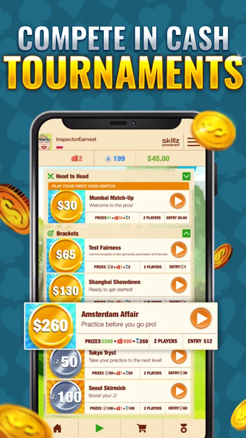 Includes large tournaments and head-to-head competition with real cash prizes (where available).