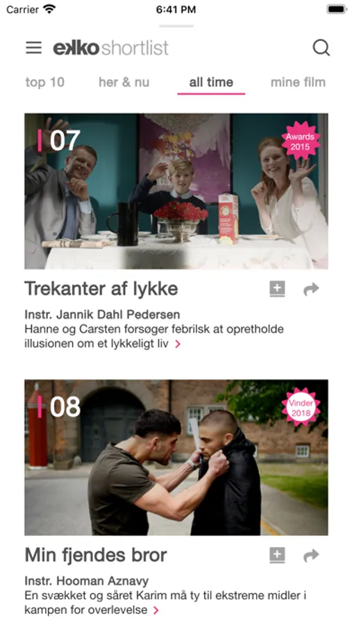 Se de nyeste film på Top 10, følg den live-opdaterede Her & nu og gå på opdagelse i All Time, hvor der ligger over 1.000 film. Med få klik kan du let biddrage til konkurrencen ved at give filmene stjerner og dele dine favoritter med vennerne på de sociale medier.