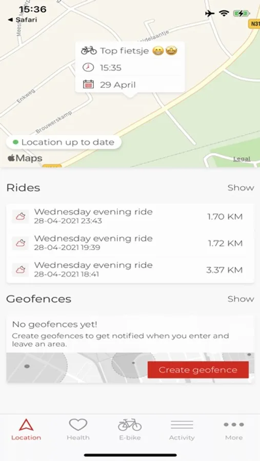 Benieuwd waar je e-bike is? De locatie van je fiets wordt op de kaart getoond. Ook zie je een overzicht van alle Stella Testcenters én de range die je nog kunt fietsen. Met je ingestelde geofences kun je een gebied aangeven. Als de fiets buiten dit gebied komt krijg je een melding.
