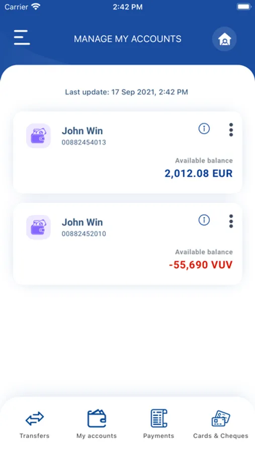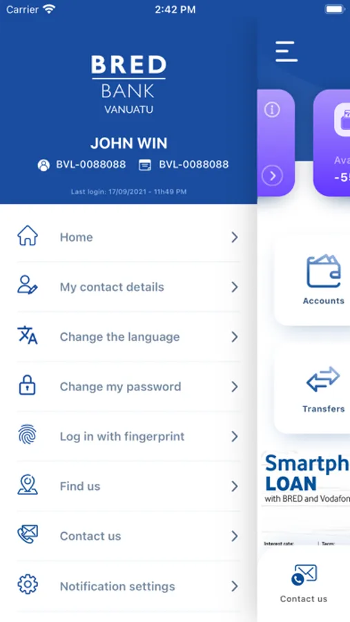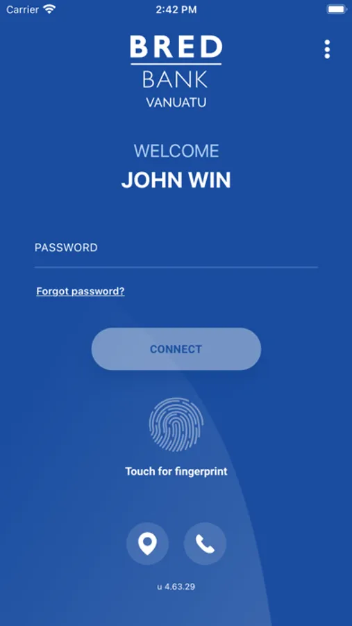 *All information transmitted via BRED Vanuatu Connect is protected with highly secure encryption methods that mask sensitive information. A password or fingerprint authentication is required every time you log in on to BRED Vanuatu Connect.