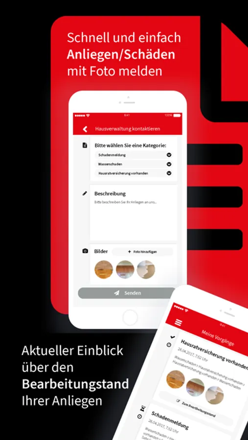 Als Mieter oder Eigentümer können Sie Schäden oder Anliegen direkt mit Fotos über unsere App melden. Ihre Anfragen stehen unseren Mitarbeitern dann zur Bearbeitung zur Verfügung und können auch an Handwerksbetriebe weitergeleitet werden.