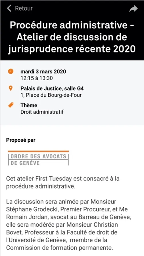 L'application de l'Ordre des Avocats de Genève permet de gérer vos inscriptions aux conférences de l'Ordre ainsi qu'à toutes les conférences répertoriées sur le site www.odage.ch.