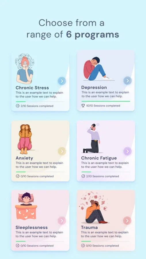 Choose from 6 targeted programs: Stress, Anxiety, Trauma, Fatigue, Insomnia/Sleeplessness, and Depression, plus the Fast Reset program for instant stress relief when feeling overwhelmed or anxious.