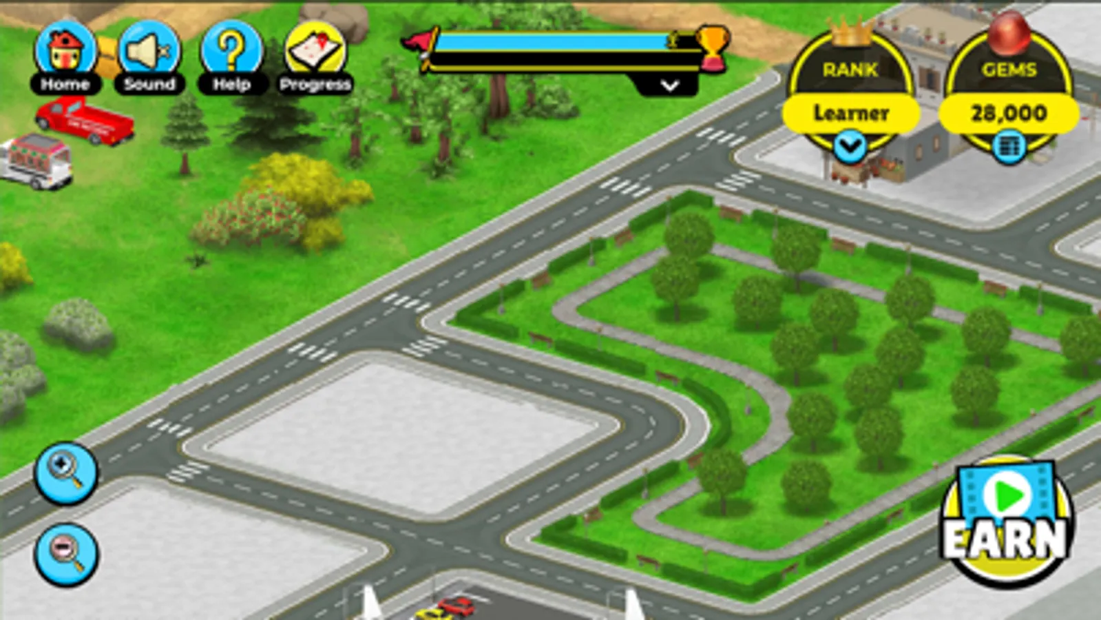 Earn gems by successfully completing challenges and use them to unlock and upgrade buildings on your map.