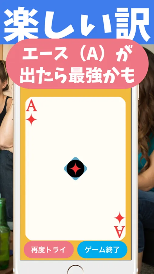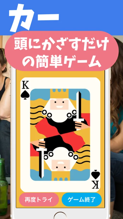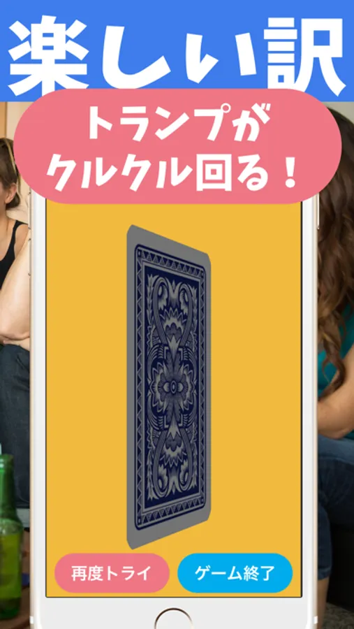② トランプが自動でシャッフルされるので、5秒以内にスマホをおでこに乗せ、画面を相手に見せましょう。
