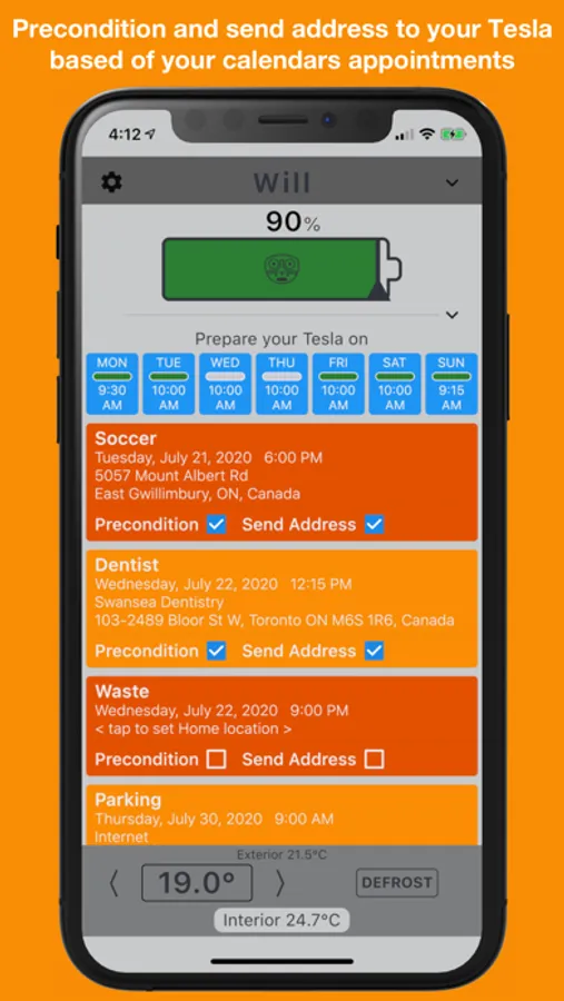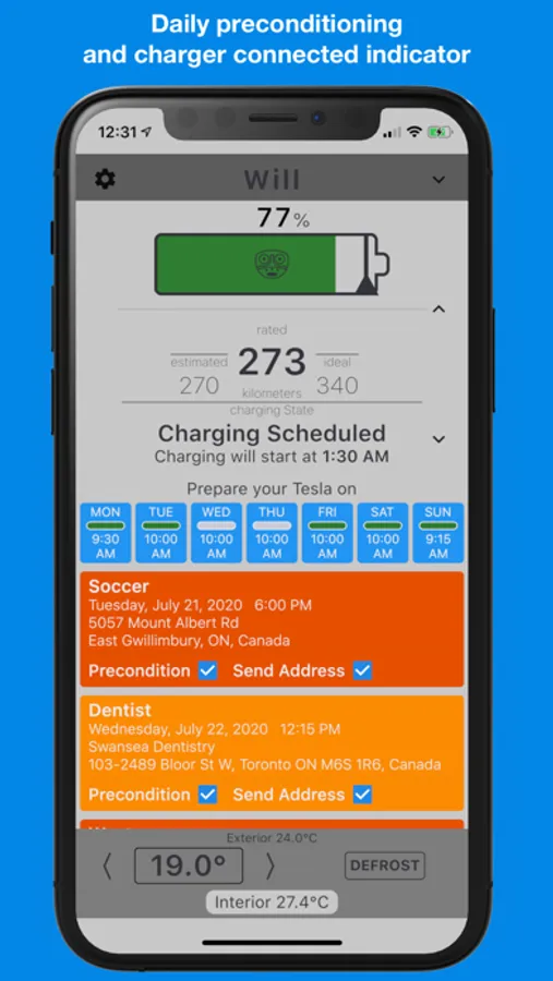 Carlazo is your personal car valet. The app reads appointments from your iPhone's calendars and allows you to precondition your car and send the destination's address to its navigation system. Using google maps and the appointment date and time, Carlazo will calculate when you should leave based on where your Tesla is currently parked and the appointment location. It will then send that address to the navigation system and turn on air conditioning closer to the departure time.