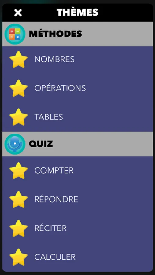 L'ensemble des contenus éducatifs est accessible depuis le menu principal, triés par thèmes ou par niveaux de difficulté.
