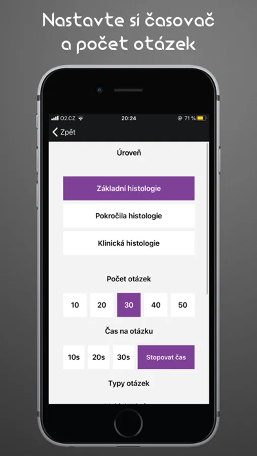 - umožňuje nastavení času a počtu otázek v rámci Testování