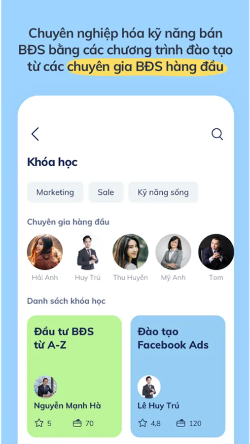 - Chuyên nghiệp hóa kỹ năng bán BĐS bằng các chương trình đào tạo từ các chuyên gia BĐS hàng đầu
