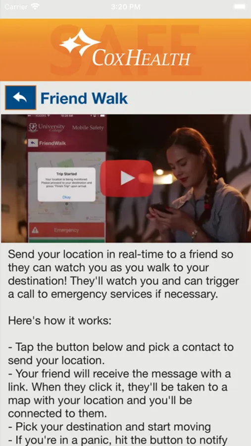 - Friend Walk: Send your location to a friend through email or SMS on your device. Once the friend accepts the Friend Walk request, the user picks their destination and their friend tracks their location in real time; they can keep an eye on them to make sure they make it safely to their destination.