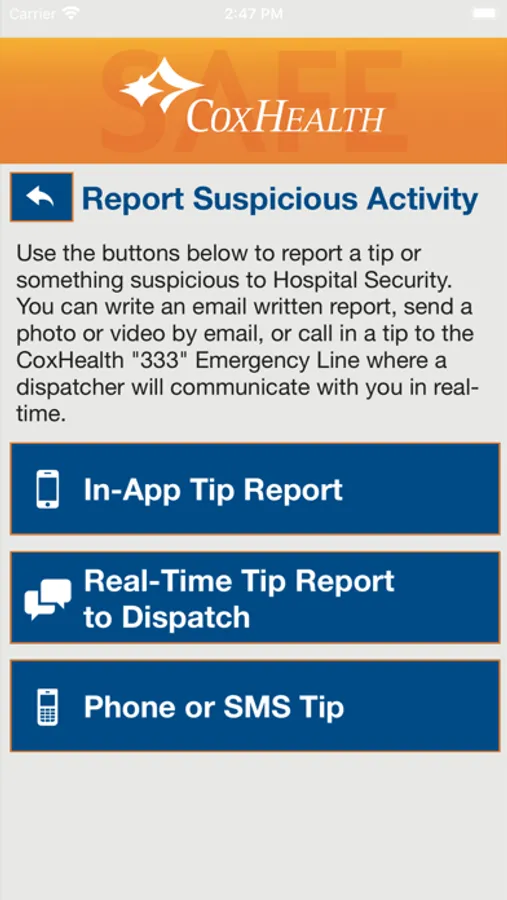 - Chat with Dispatch: Communicate live with security staff at CoxHealth via chat.