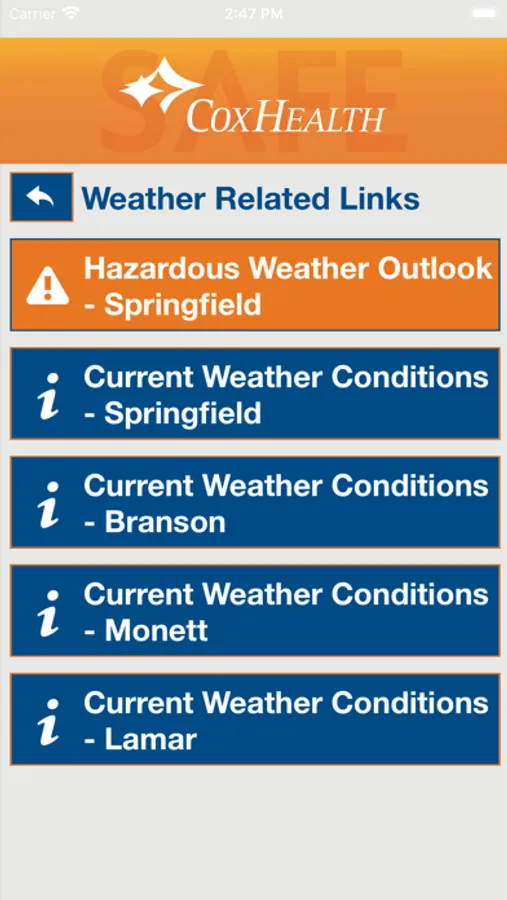 CoxHealthSAFE is the official safety app of CoxHealth. It is the only app that integrates with CoxHealth’s safety and security systems. Hospital Security has worked to develop a unique app that provides visitors and staff with added safety. The app will send you important safety alerts and provide instant access to safety resources.