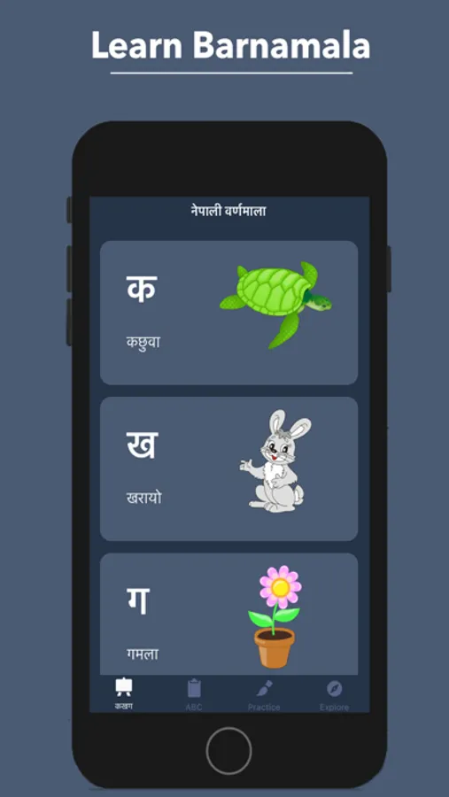 Home - Contains all of the Nepali and English Alphabets. Each picture has audio pronunciation that you can hear just tapping on pictures, words, and alphabets.