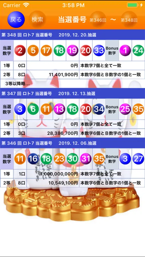 ④ オフラインで便利。上記機能について、④番目の当選番号自動更新機能以外は、すべての機能はオフラインでも利用可能です。通信料を節約するとともに、便利!