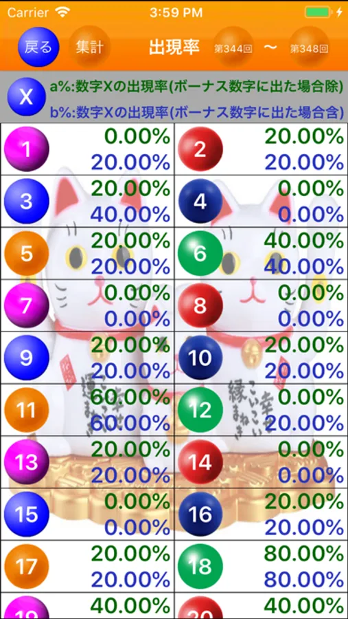 ② 各数字の出現率の集計。何回目からも何回目までもの各数字の出現率を集計することは可能です。例えば、第300回から第304回まで、数字6が一回だけ出た場合は、6の該当出現率は 1 / 5 = 20% です。