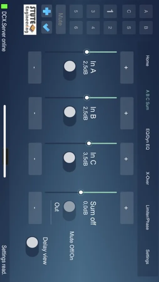 • Input A/B/C/Sum: Gain, Mute, Delay, EQ 1..9, Dynamic EQ, Sum In A/B/C