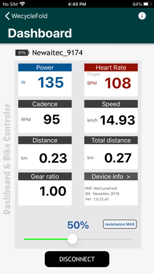 The dashboard allows you to connect to your bike's sensors via BLE, which displays data such as power, heart rate, cadence, speed, etc. The manual resistance control function is provided by the slider.