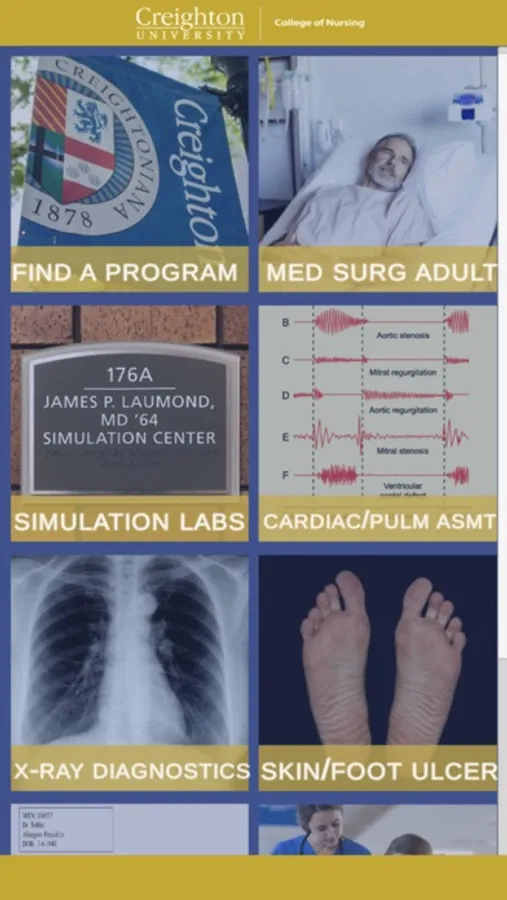 This app contains Medical Surgical Adult, Simulation Labs, Cardiac/Pulm assessment, X-Ray Diagnostics, Skin/Foot Ulcer, Lab Reports, and Forensics.