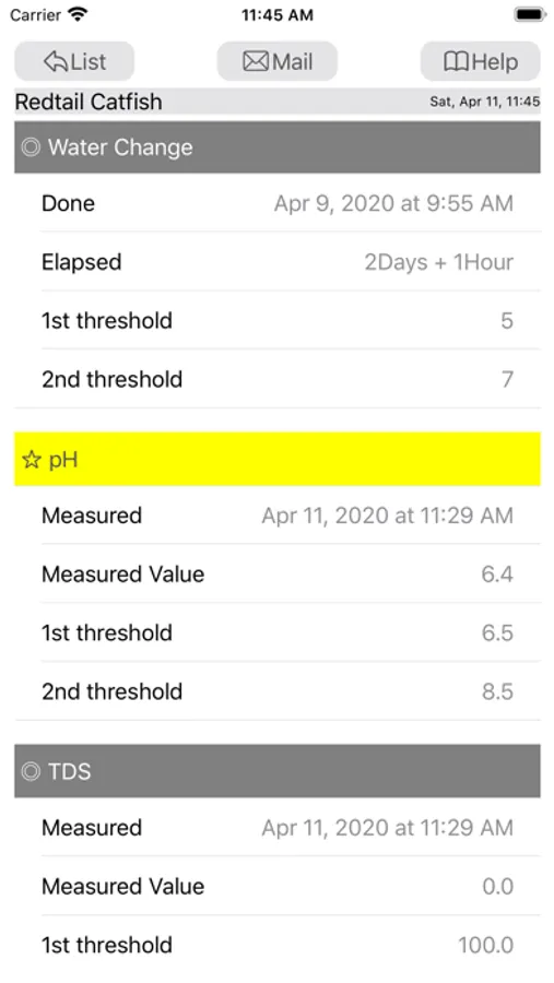 - TDS: Measurement date and time, measurement value, 2 levels of alarm level