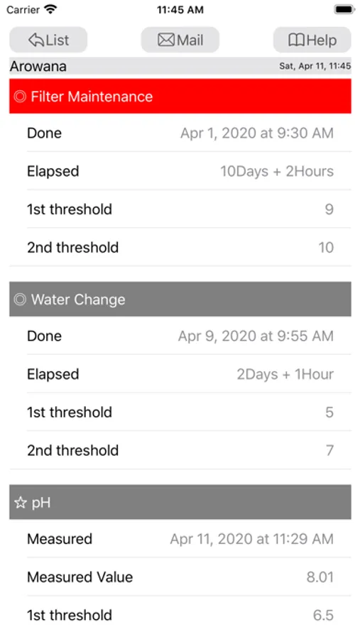 - Water exchange: date and time, elapsed days, two-stage alarm