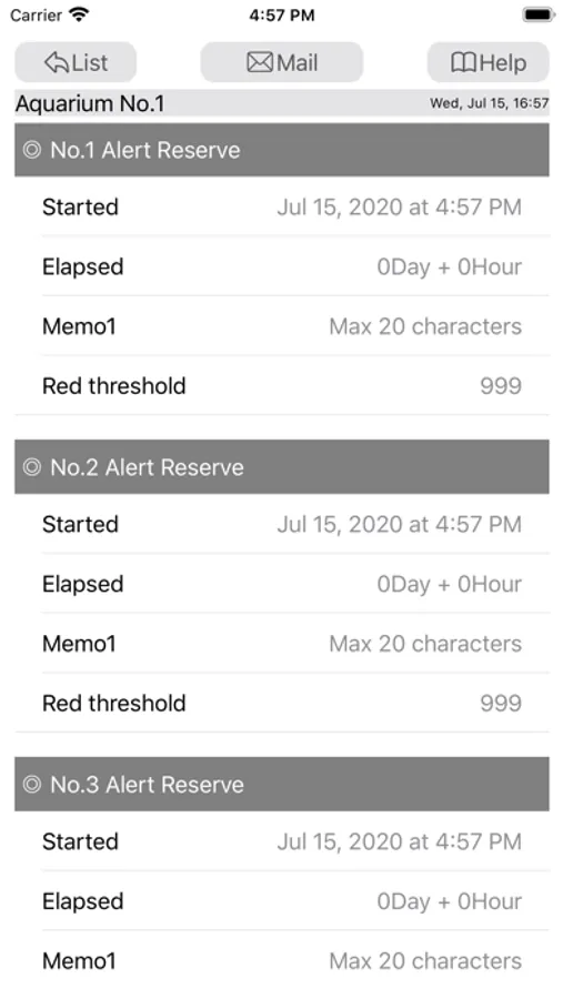 - Reserve 1-3 (with alarm): Date and time, number of days elapsed, memo 1, number of alarm days