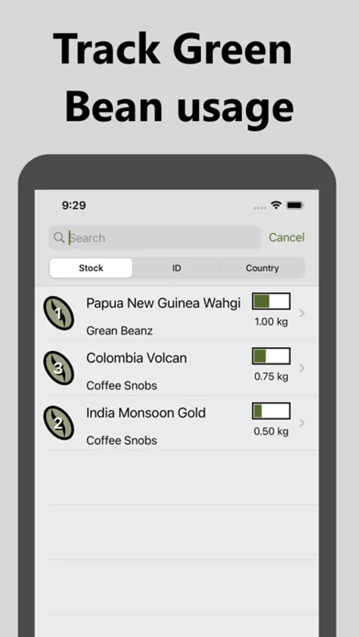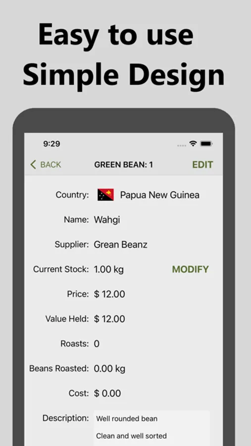 Simple calculations done for you. Roast any amount of beans and it will be automatically deducted from your green bean Inventory.