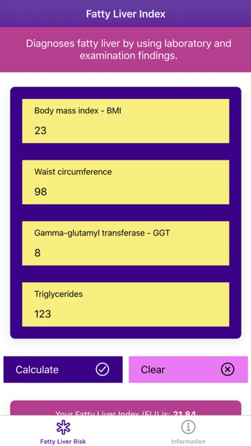 "Fatty Liver Risk - Screening of Liver Health" is a medical tool to predict whether you have fatty liver from clinical examination findings and laboratory results. It requires the user to input body mass index (BMI), waist circumference, gamma-glutamyl transferase (GGT), and triglicerydes. The "Fatty Liver Risk - Screening of Liver Health" app will then classify the risk into 3 categories (low, intermediate, and high risk). This "Fatty Liver Risk - Screening of Liver Health" is intended to help medical practitioner to calculate the risk of a person diagnosed with fatty liver by calculating the fatty liver index.