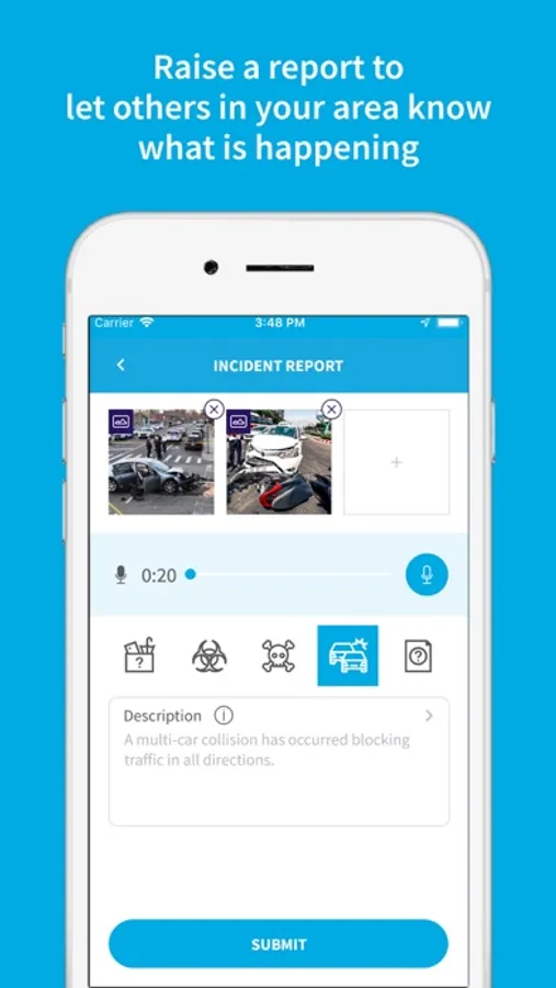 - Report and share incidents such as robberies, car accidents, and lost items.