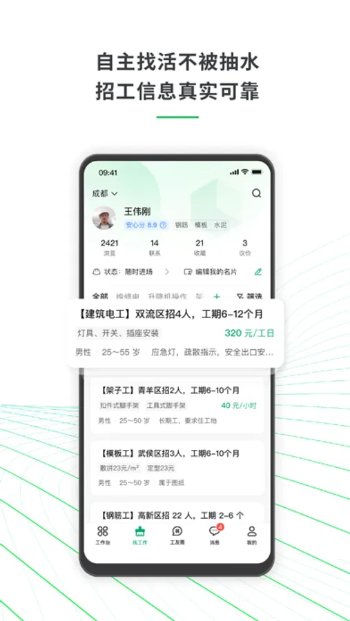 安心筑APP是一智科技有限公司以“建筑+互联网”理念,倾力打造的一款以保障建筑工人工资支付为核心的专业APP,班组/工人通过线上分发任务、接收任务、确认记工、绑定银行卡等动作,保障建筑工人工资按时足额发薪到卡,是工友们的贴心管家、安心卫士。