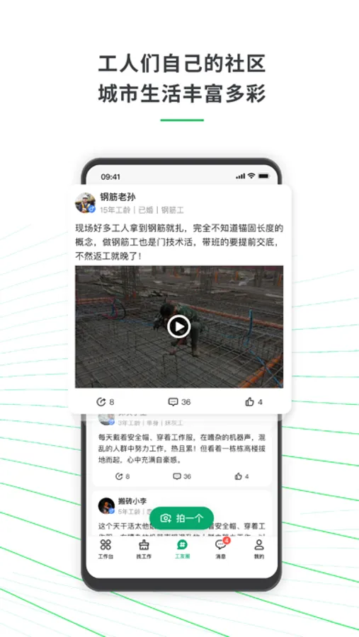 木工、泥工、钢筋工、混凝土工、油漆工、玻璃工;起重工、吊车司机和指挥、电焊工、机修工、维修电工;测量工、防水工、架子工、水工、电工、杂工等多样工种的建筑工友。