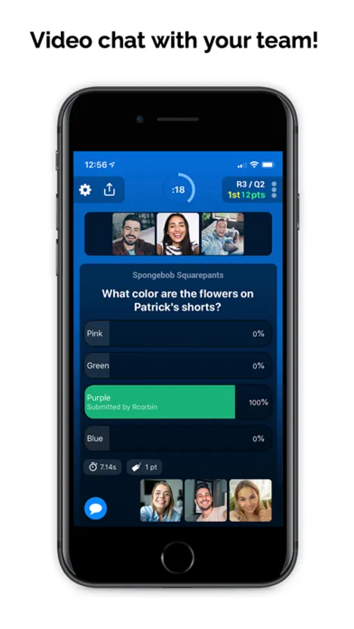 Play in virtual trivia events where you group video chat with your team while you watch the host. You can even jump on the virtual stage to join your host!