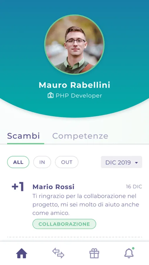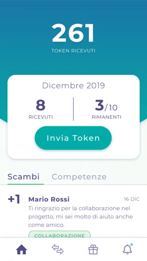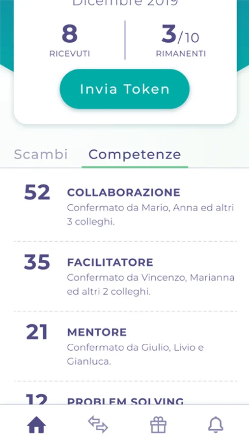 - Sezione Stats: la tua overview. A colpo d’occhio verifica l’andamento mensile dei token ricevuti e il grafico di tutte le competenze segnalate dai tuoi colleghi.