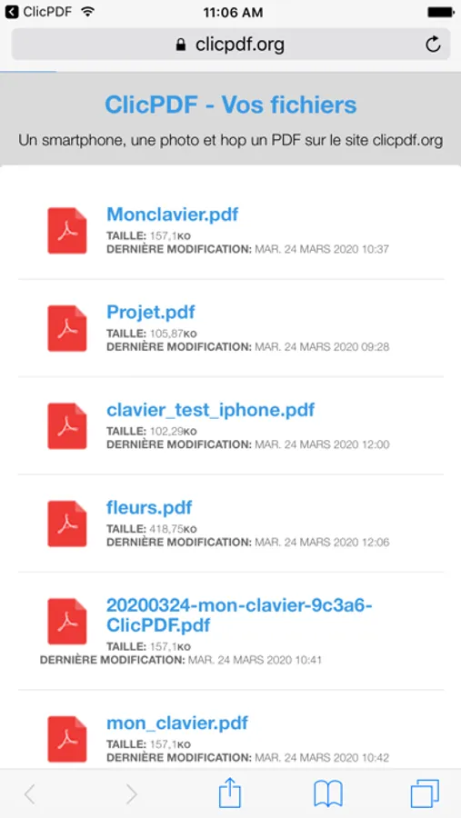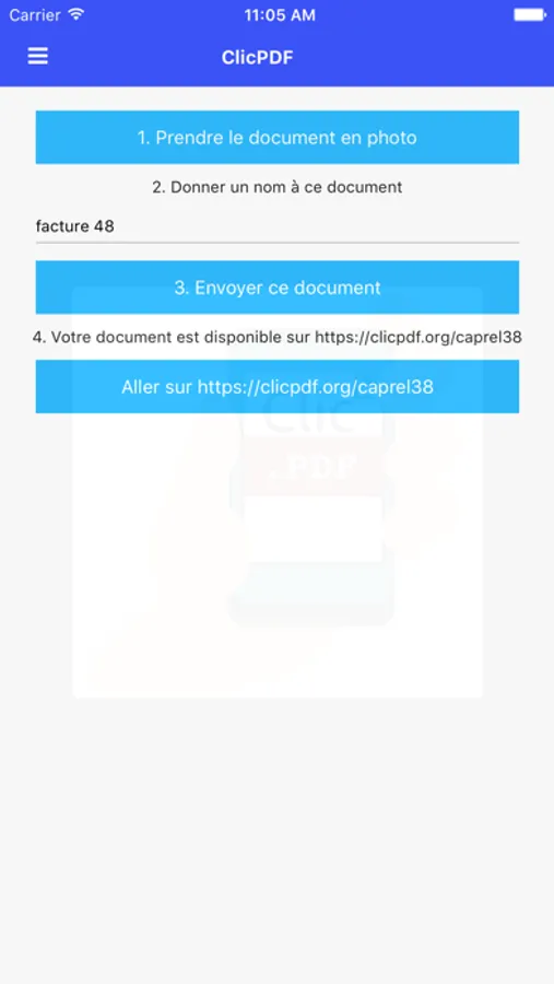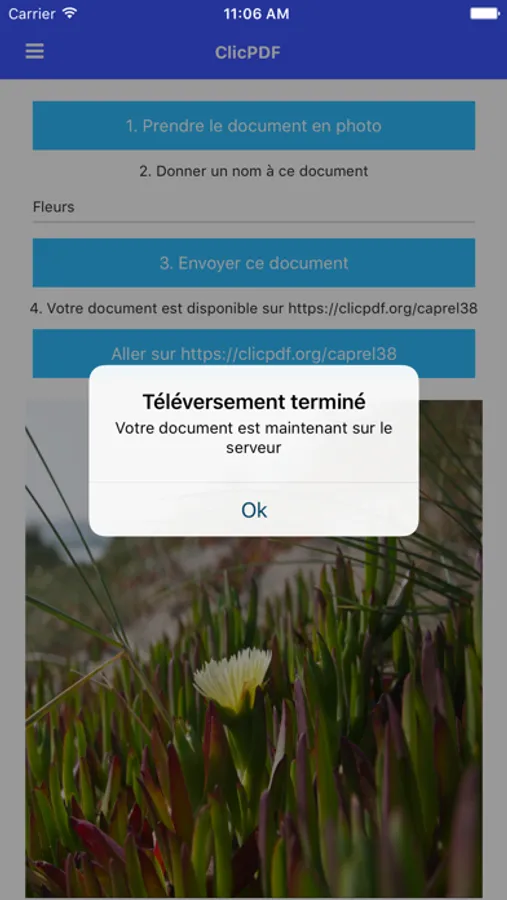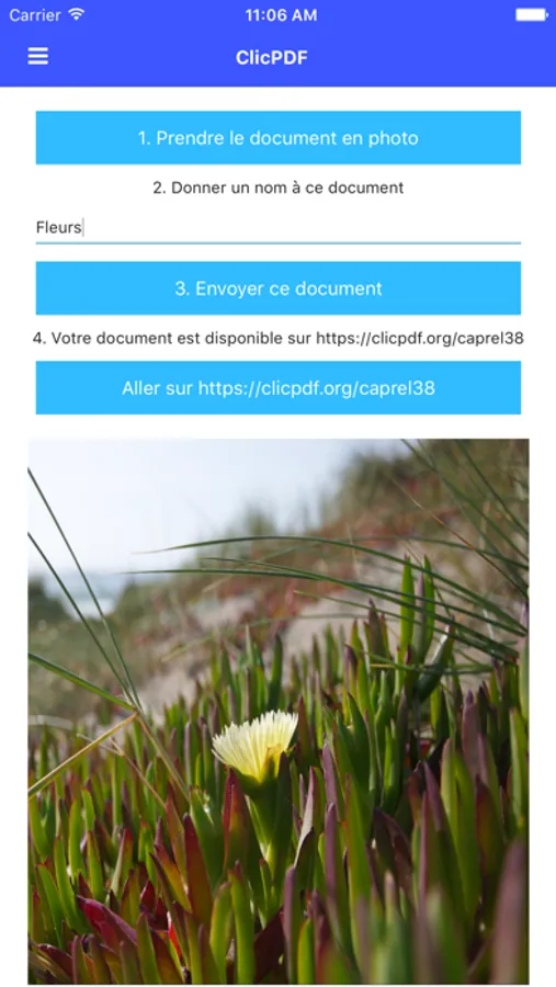 Cette application vous permet de faire une photo d'un document et de l'envoyer automatiquement sur le serveur temporaire clicpdf.org, 4h plus tard votre fichier sera supprimé du serveur relais ... Ça vous laisse le temps d'aller télécharger votre fichier pour en faire ce que vous voulez :-)
