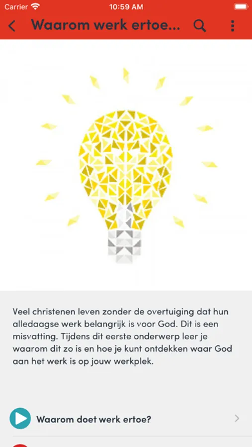 Kroon op je Werk brengt werkende christenen bij elkaar, die als groep onderweg gaan om samen meer te leren over God, geloof en werk. Dit kan een nieuwe groep zijn, maar net zo goed een bestaande kring uit een kerk of gemeente. Het materiaal is onderverdeeld in 8 onderwerpen die in 15 sessies behandeld worden. Dit kan je allemaal vinden in deze app.