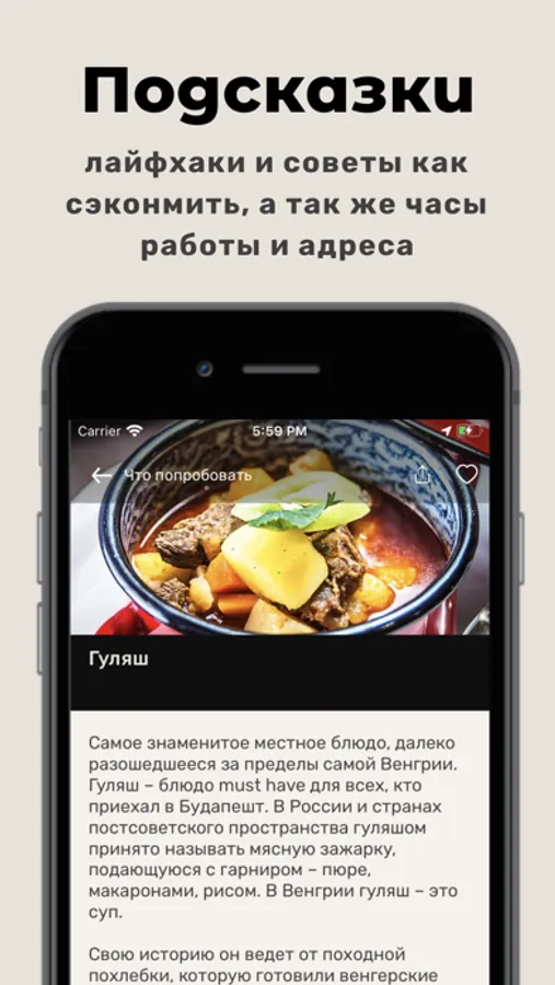 В этом приложении собрано все, что сделает ваше путешествие в Венгрию незабываемым. Посетите самые известные достопримечательности, исследуйте смотровые площадки и секретные места, распробуйте на вкус блюда венгерской кухни и познайте силу термальных купален. Лайфхаки, советы, адреса и время работы, а также описания всех главных достопримечательностей Будапешта теперь доступны в вашем телефоне без подключения к интернету.