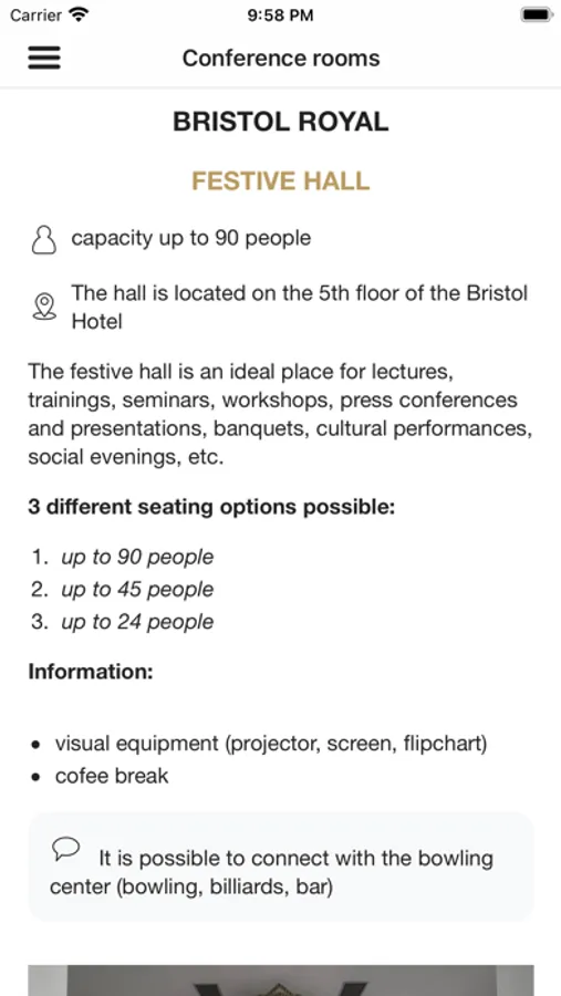 The Bristol Group app contains important information about the hotel complex in Karlovy Vary. You will find all the necessary information about the hotels in this complex, the possibility of booking directly from the application, special offers, procedures and meals in these hotels. The application also contains information about conferences and necessary contacts. There is also a QR code reader, thanks to which you can immediately find out which part of the complex you are in.