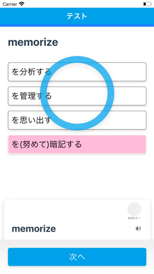 「弱点克服テスト」では「テスト」で間違えた単語を集中的に学習できます。