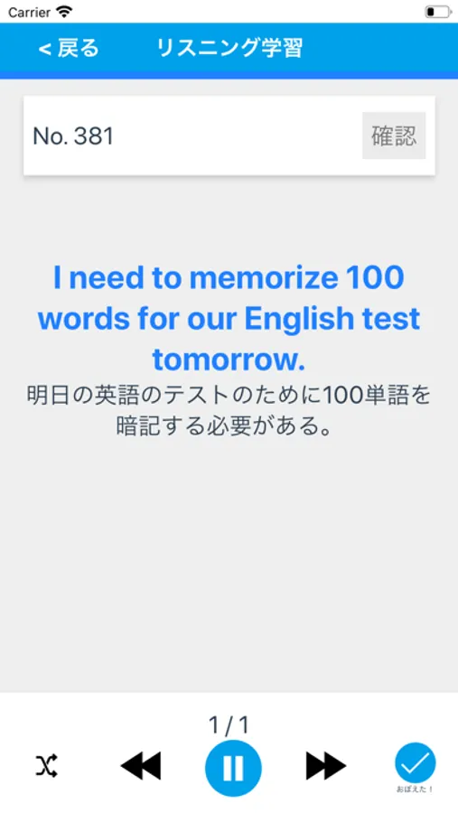 リスニング画面右上の「確認」をタップすると見出し語の詳細を確認できます。