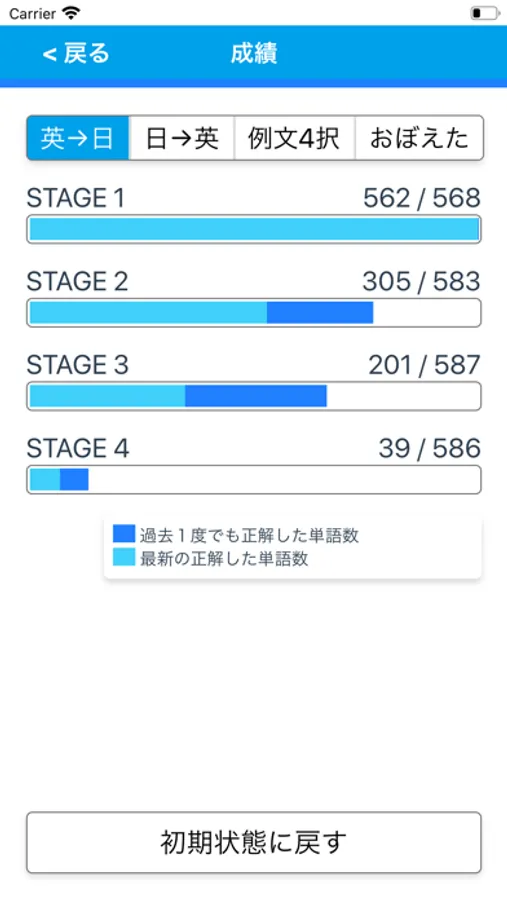 両モードとも,「日・英」,「英・日」,さらに例文の中で英単語を問う「例文4択」の3つの問題形式に対応しています。