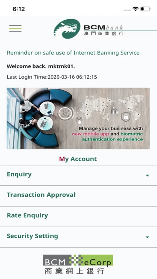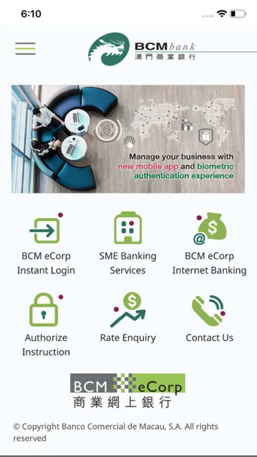 BCM bank brings you a new eCorp mobile banking experience by introducing the new biometrics authentication, including fingerprint authentication, facial recognition authentication or self-defined security passcode to authenticate your identity and login mobile banking service and perform transaction approval in a simplified and safe way. You can conveniently control all your business finance at your fingertips.