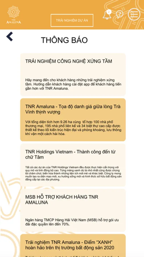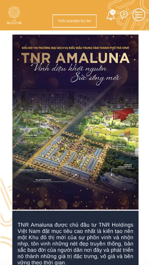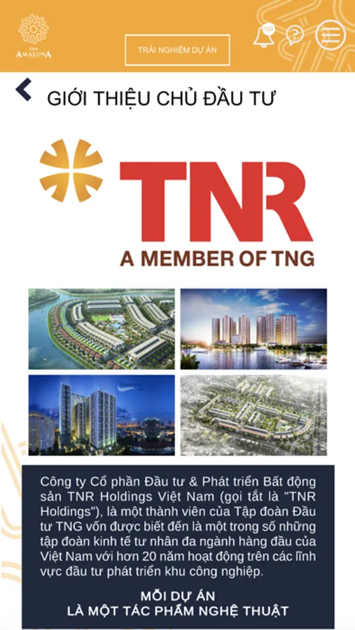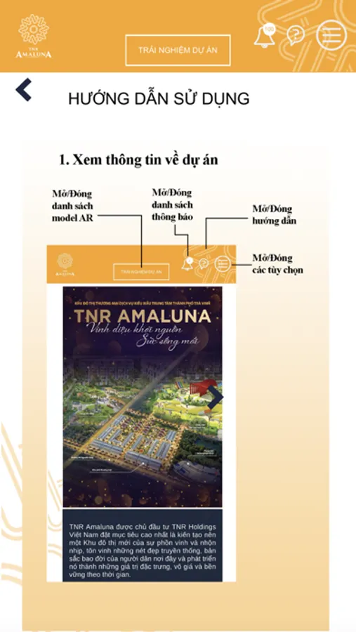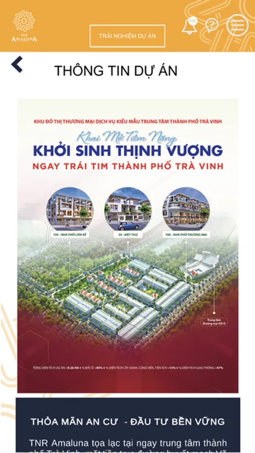 APP TNR Amaluna có hệ thống thông tin được lưu trữ hết sức khoa học, trực quan, thân thiện. Dù ở bất cứ nơi đâu, với vài cú chạm, người sử dụng có thể thăm quan chi tiết đến từng ngóc ngách của dự án, qua đó tất cả thông tin dự án sẽ nằm gọn trong lòng bàn tay.