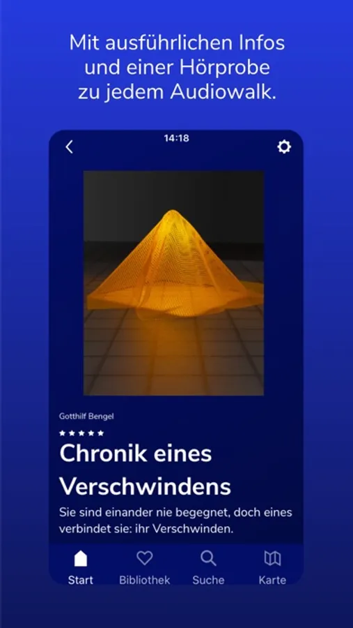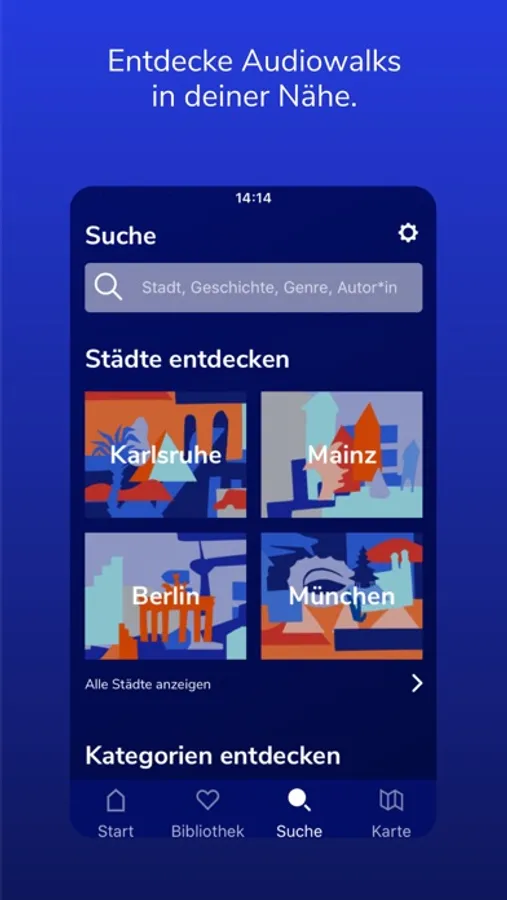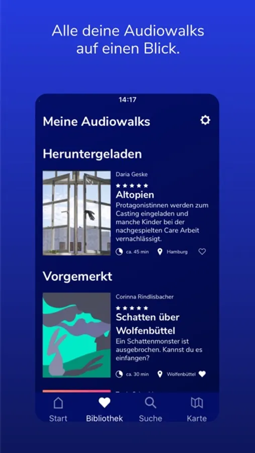 Storydive ist eine Plattform, auf der du ganz unterschiedliche Audiowalks von Autor*innen aus verschiedenen Städten findest. Lass dir Audiowalks in deiner Nähe anzeigen, abonniere Orte und merke Spaziergänge vor, die dich besonders interessieren. Wähle selbst, ob du die Audiowalks streamen oder herunterladen möchtest. Entdecke Genres und Kategorien, die zu dir passen.
