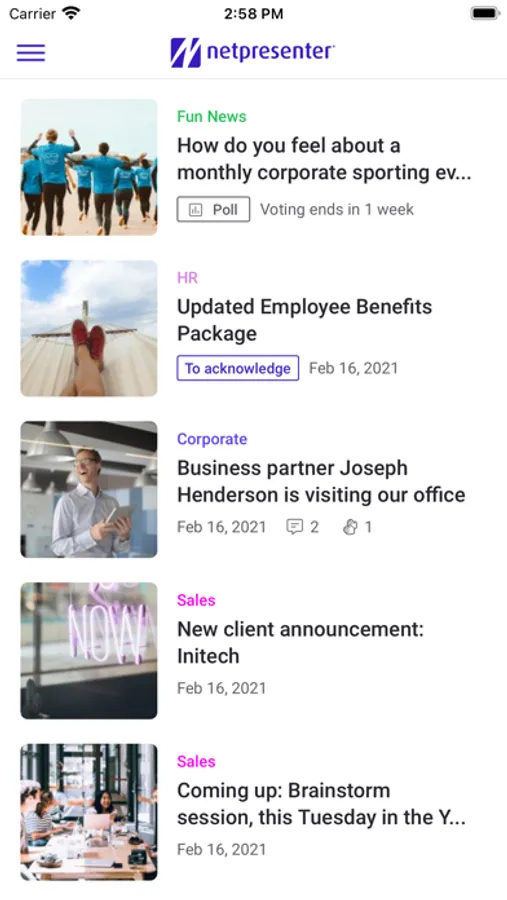 Keep your employees informed, engaged, productive and safe, wherever they are! With NEXT, the next step in corporate communication by Netpresenter, you easily share company news, important announcements, polls and alerts with your entire workforce. Target everyone, or show content to specific locations, departments or even individuals to make content personalized and relevant. Boost engagement by allowing employees to interact on corporate news with reactions and comments.